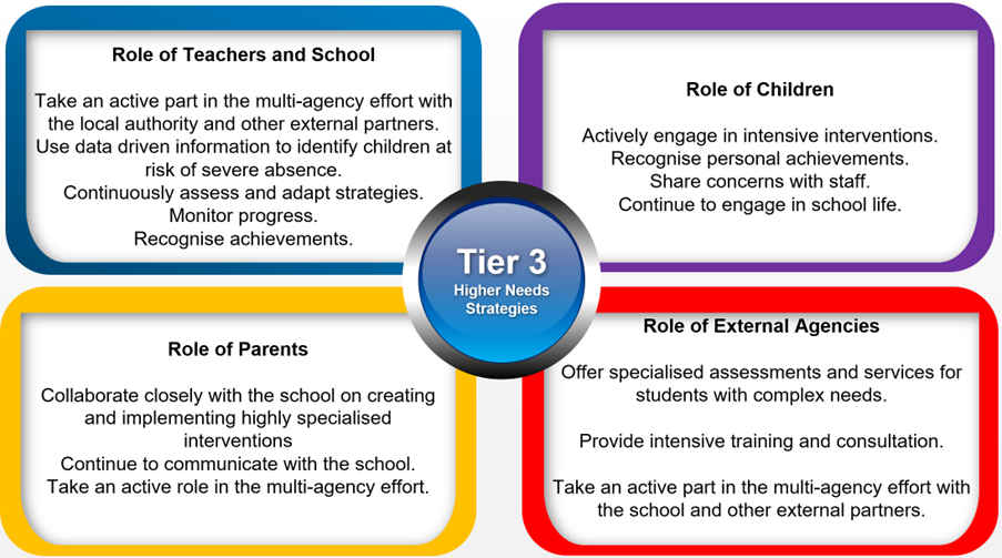 Tier 3 – Higher Needs Strategies Support: Specialised support for children, young people, and families with complex attendance requirements, including access to external agency support when necessary.
